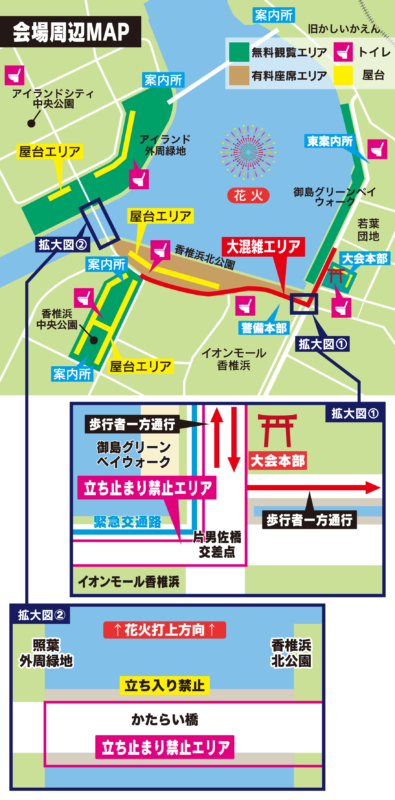 3カ所の無料観覧エリアのほか、打ち上げ場所の近くにゆっくり楽しめる有料座席エリアもあります。