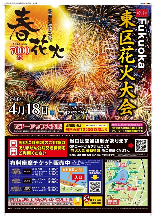 福岡の春を彩る「第31回Fukuoka東区花火大会」が 2026年4月18日(土)開催されます。