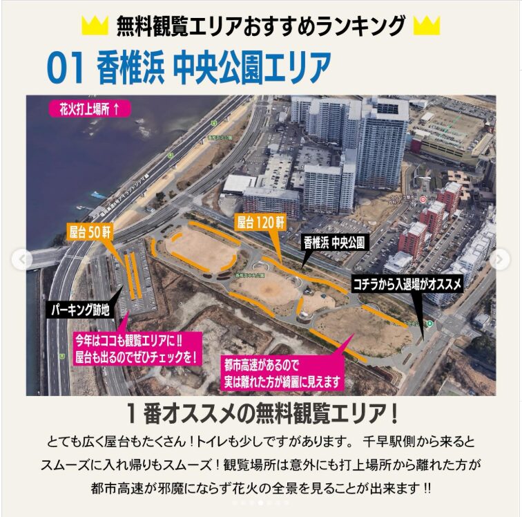 湾中央付近海上(台船)から打ち上げるので、香椎浜エリア一帯から花火を鑑賞できます。