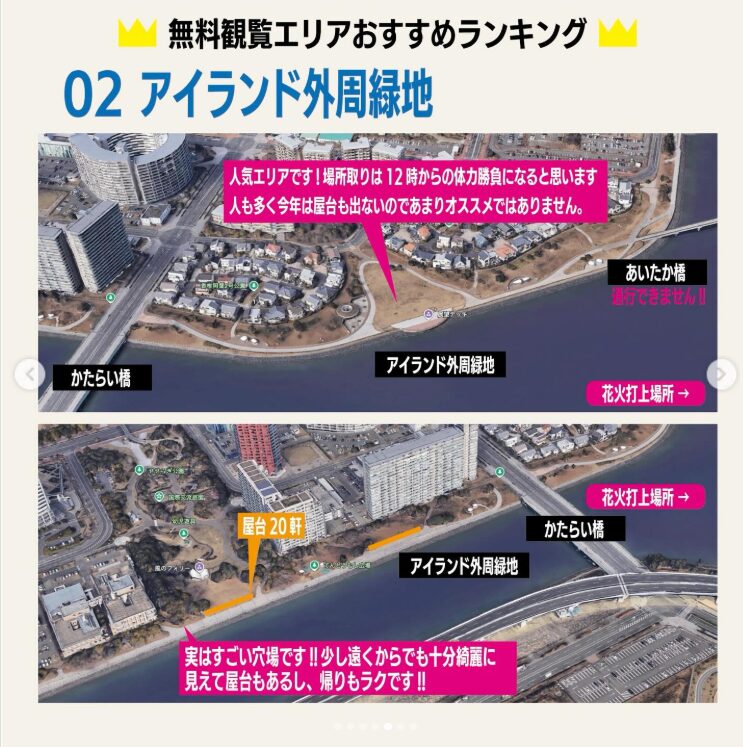 3カ所の無料観覧エリアのほか、打ち上げ場所の近くにゆっくり楽しめる有料座席エリアもあります。