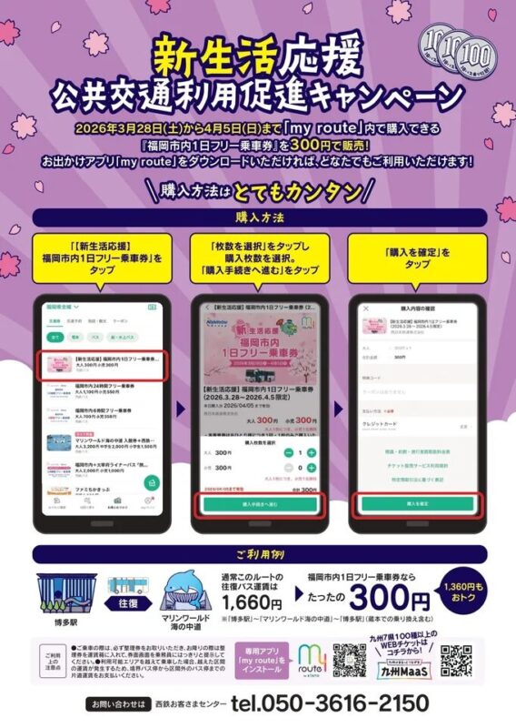 2026年3月28日〜4月5日の 9日間限定で、通常1,200円 → 300円、福岡市内の西鉄バスが 1日乗り放題となります。