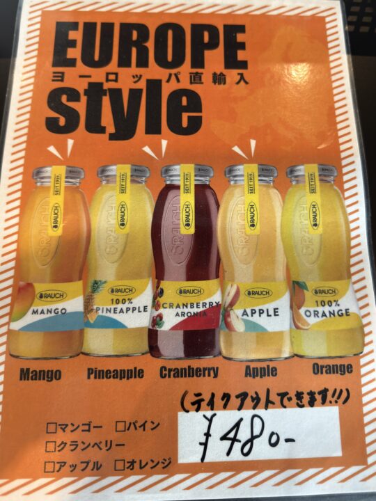 追加+100円で、ヨーロッパ直輸入100%ジュース(通常480円)も選択可。