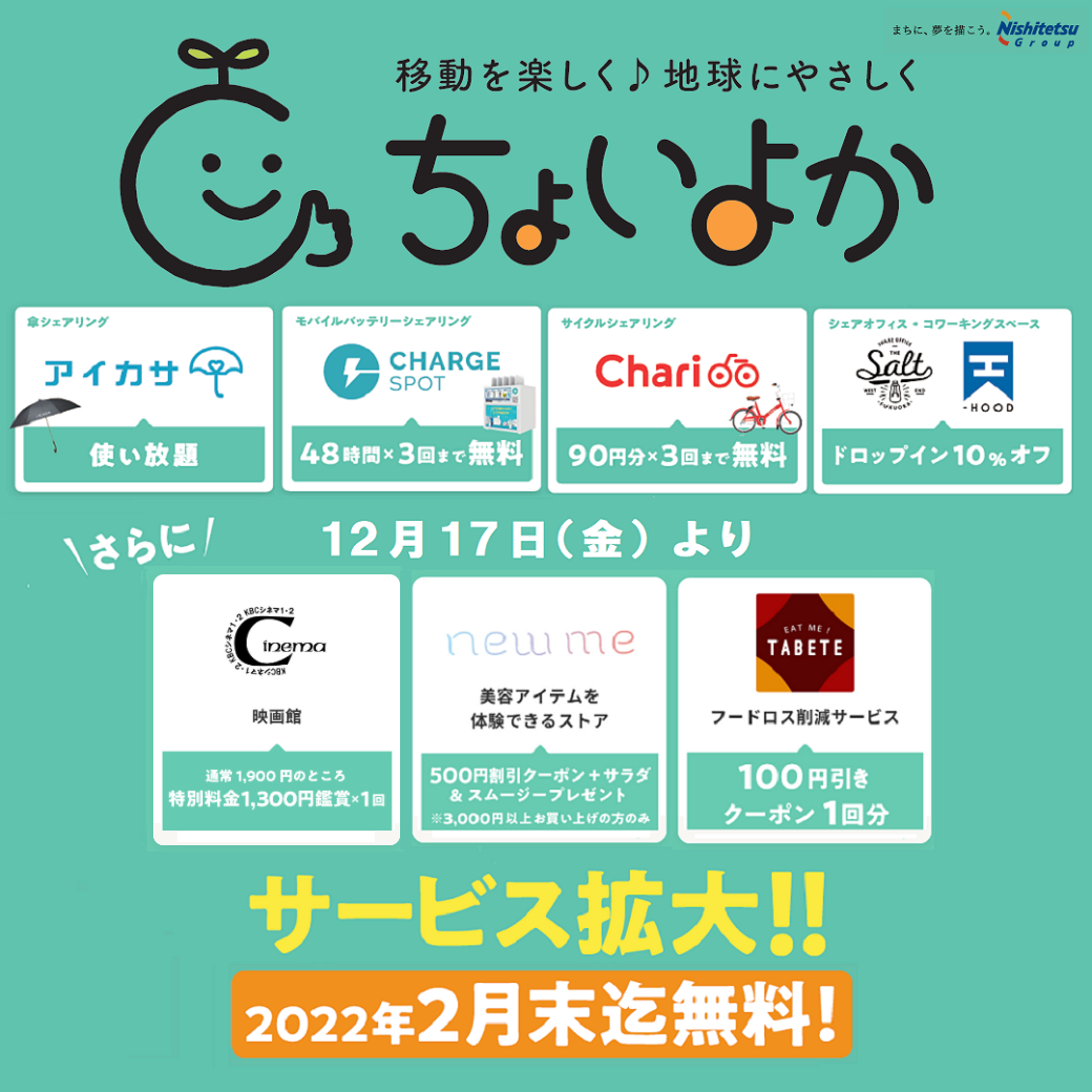 西日本鉄道株式会社のプレスリリース(2021年12月17日 18時07分)「移動を楽しく、地球にやさしく」サブスクリプション型サービス「ちょいよか」の提供サービスを拡大いたします!