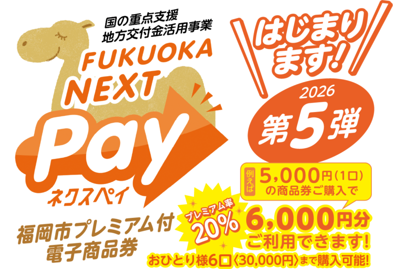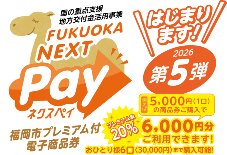 福岡市のプレミアム付き電子商品券 「FUKUOKA NEXT Pay(ネクスペイ)」第5弾 が、2026年3月13日(木)午前9時から抽選受付開始 となります。