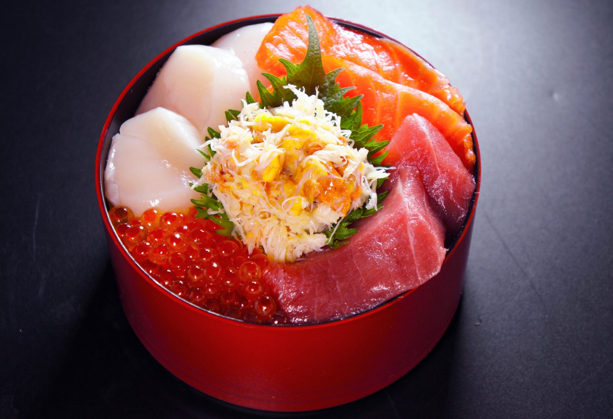生うにを和えた毛ガニのむき身をはじめ、ほたて、サーモン、いくら、中トロののったインパクト抜群な弁当です。