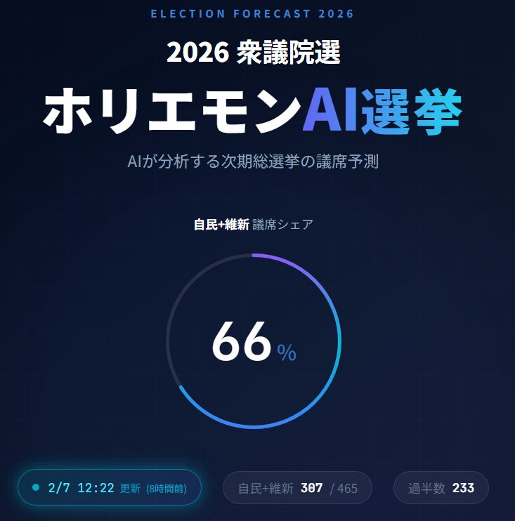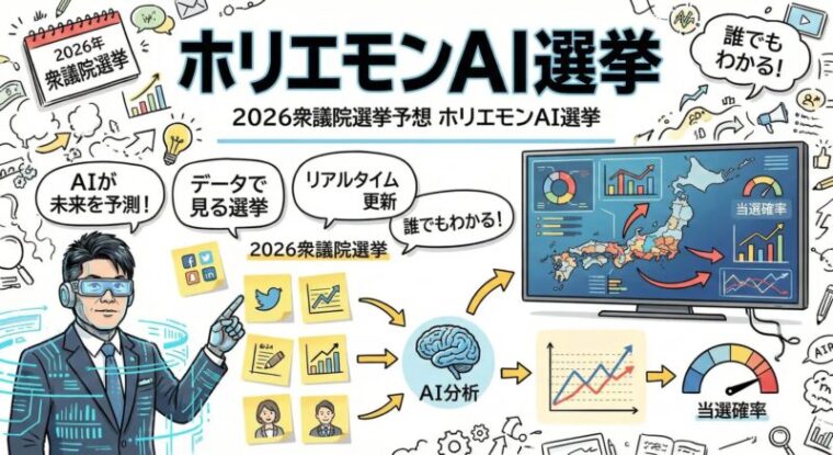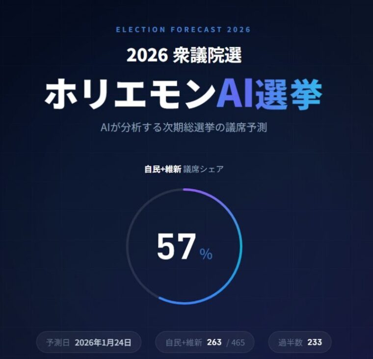 ホリエモンAI学校株式会社は、2026年の衆議院議員総選挙に向け、AIが選挙情勢を解析し小選挙区289・比例代表176の全465議席の獲得議席数を予測するサービス『ホリエモンAI選挙』を公開。