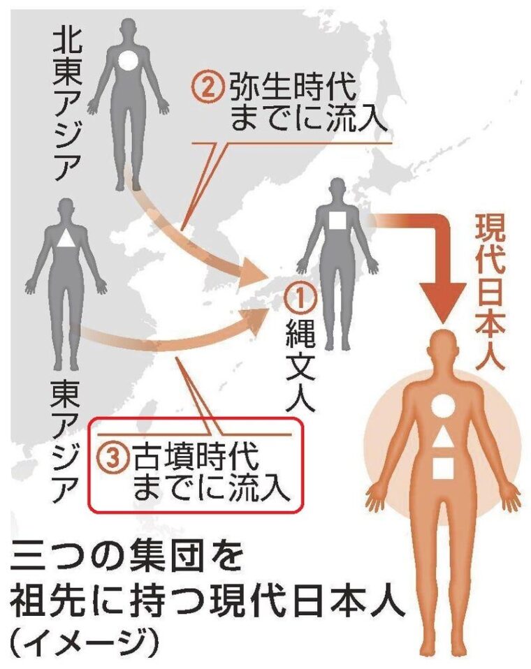 現代の日本人は大陸から渡ってきた3つの集団を祖先に持つことが全ゲノム解析で明らかになっています。