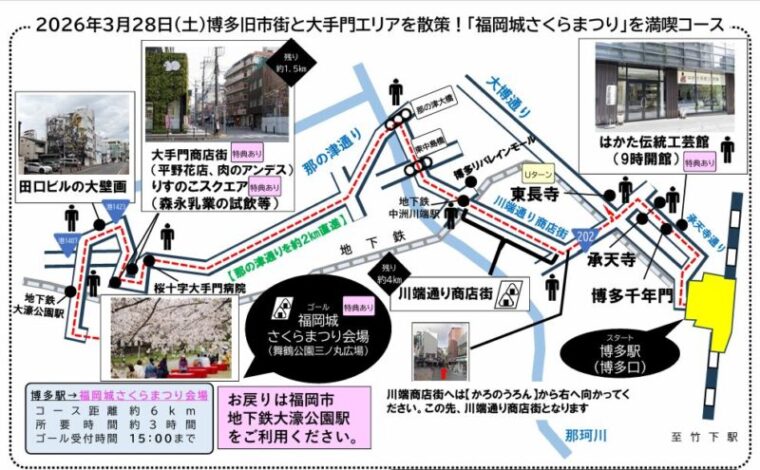 博多駅から旧市街エリアを抜け、那の津・大手門方面へ歩き、最後は福岡城さくらまつり会場でゴールという、2026年春の新規コースです。