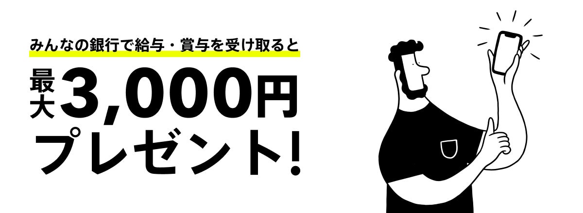 期間中にみんなの銀行で給与や賞与を受け取ると、現金を最大3,000円プレゼント!