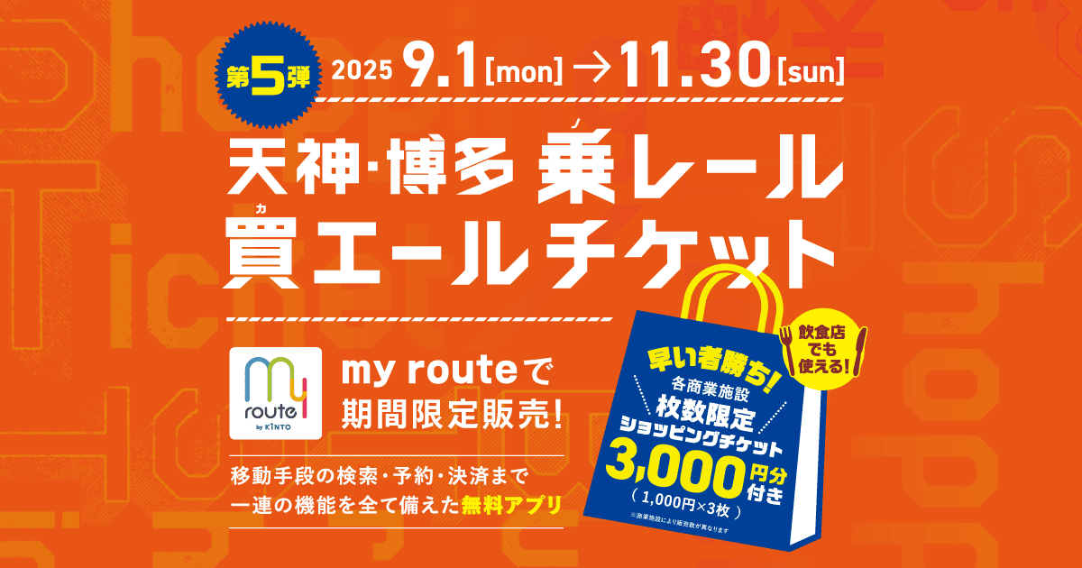 2024 年9⽉1⽇(⽇)から11⽉30⽇(⼟)まで、おでかけアプリ「my route」内で販売される「天神・博多 乗レール買エールチケット」をご紹介しました。