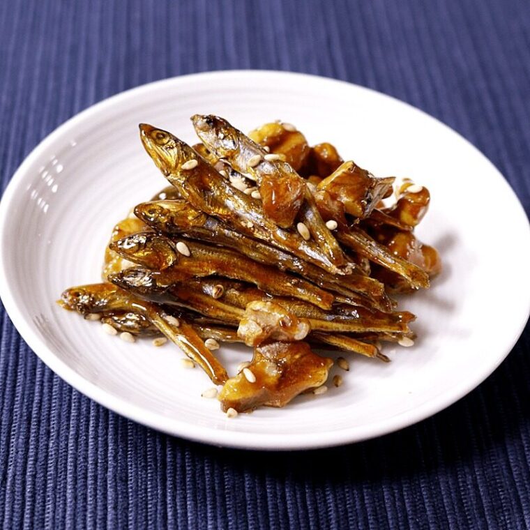 関東では「田作り」、関西では「ごまめ」と呼ばれる同じ料理。(カタクチイワシの甘辛煮)