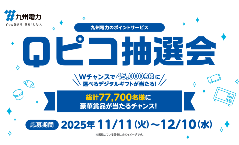 2025年11月11日(火)〜12月10日(水) の期間中、九州電力の契約者限定で貯めた「Qピコ」を使って抽選に参加でき、総計77,700名に豪華賞品が当たります。