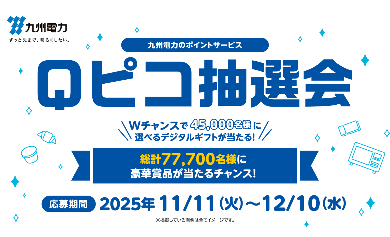2025年11月11日(火)〜12月10日(水) の期間中、九州電力の契約者限定で貯めた「Qピコ」を使って抽選に参加でき、総計77,700名に豪華賞品が当たります。