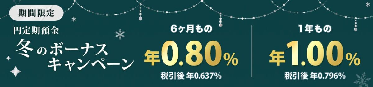 楽天銀行では、2025年11月21日(金)から2026年1月31日(土)までの期間限定で「円定期預金 冬のボーナスキャンペーン」を実施しています。