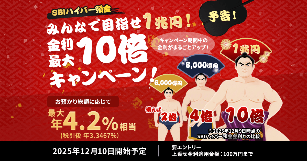 SBI新生銀行が2025年12月10日からスタートする 『みんなで目指せ1兆円!SBIハイパー預金 金利最大10倍キャンペーン』は、参加者全員で残高を積み上げることで金利がどんどん上がっていく、前代未聞の企画です。