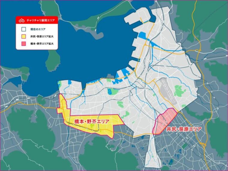 チャリチャリの利用可能エリアは、順次拡大されています。