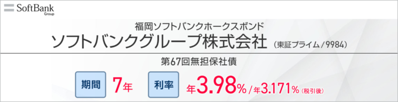 | ソフトバンクグループ株式会社 第67回無担保社債 | 3.98% | 本債券は100万円以上100万円単位で買付可能。 債券は預金と異なり元本保証がありません。 |