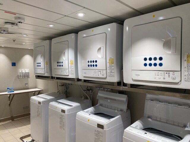 ※飛鳥Ⅲには24時間無料で利用できるセルフランドリーがあり、洗剤や乾燥機も備わっているため、枚数は5〜7日分で十分に回せます。