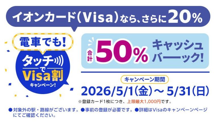 2026年5月1日(金)から、Visaが実施する「電車でも!タッチでVisa割キャンペーン」では、Visa本体の30%還元に加えて、イオン・エポス・三井住友カードの20%上乗せが加わり、最大50%還元。