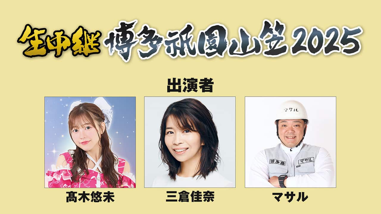 | 出演 | ●ゲスト 宮川大輔(お笑い芸人)、井桁弘恵(モデル・タレント) ●解説 樋口葛尚(博多祇園山笠振興会) ●放送席司会 森田哲意(アナウンサー) ●山留めリポート 姫野美南(アナウンサー) ●廻り止めリポート 見浪哲史(アナウンサー) |